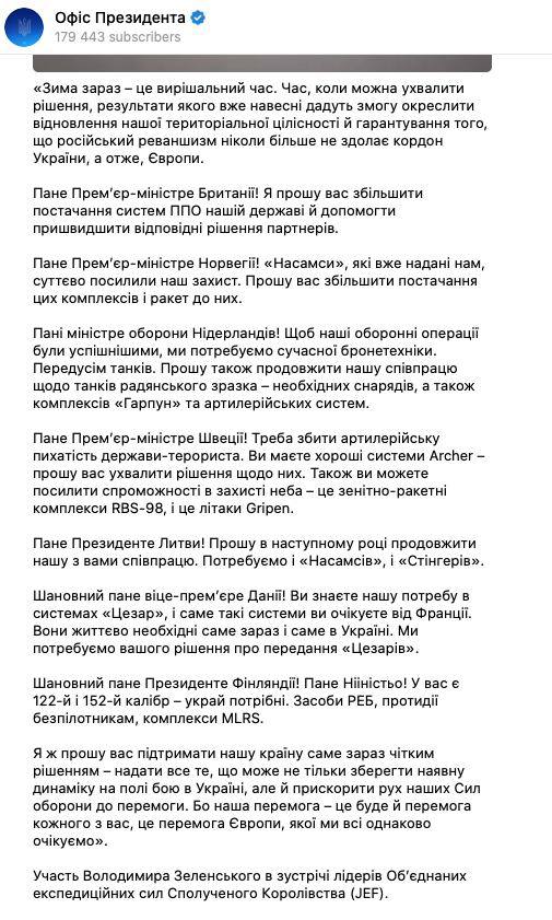 • Сообщил о своем обращении к лидерам объединения стран Северной Европы с призывом дать оружие и ПВО.