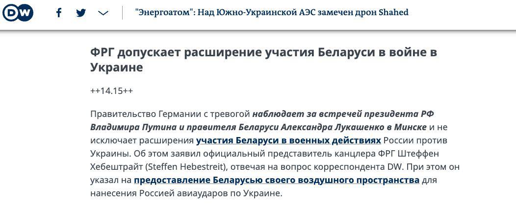 14.51 Берлин опасается, что после встречи Путина и Лукашенко (https://t.me/stranaua/81300) Беларусь расширит свое участие в войне РФ против Украины.