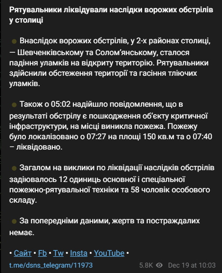 В результате утренних обстрелов, в двух районах Киева, Шевченковском и Соломенском, произошло падение обломков на открытую территорию. Спасатели провели обследование территории и потушили тлеющие обломки.