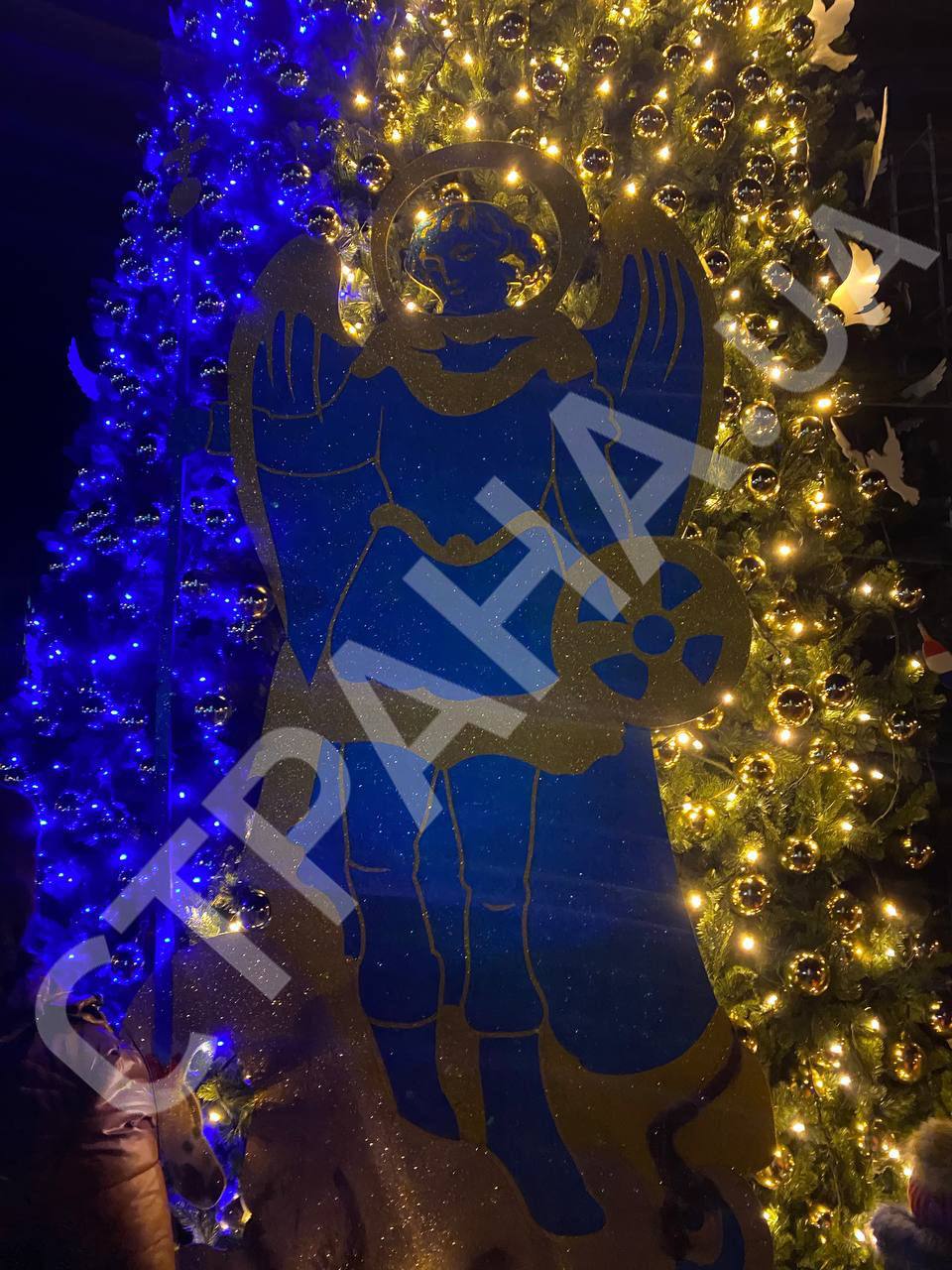 На новогоднем дереве развесили фигурки белых голубей и шары с флагами стран, которые помогают Украине в войне. Возле елке установлена фигура ангела-хранителя. Венчает дерево не традиционная звезда, а трезубец.
