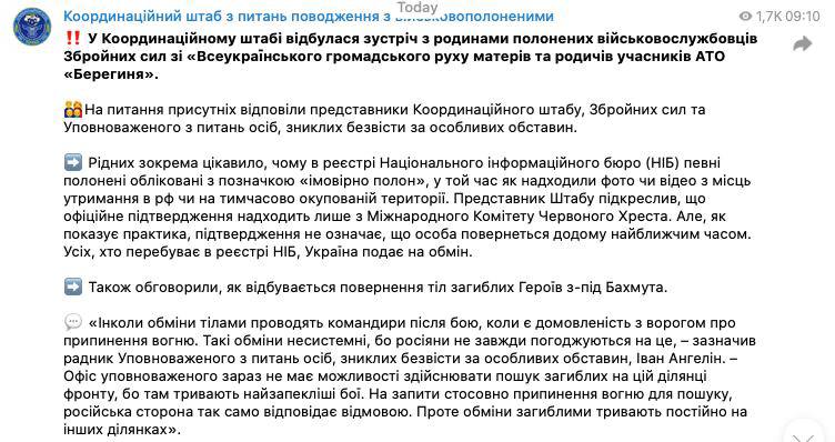 "Но такие обмены не системны, потому что россияне не всегда соглашаются на это", – говорит советник уполномоченного по вопросам пропавших без вести. При этом, по его словам, договориться о поиске тел погибших под Бахмутом не получается из-за интенсивных боев.