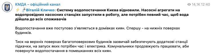 13.00 Систему водоснабжения Киева частично восстановили и вода начинает постепенно появляться в домах киевлян, сообщает мэр Виталий Кличко.