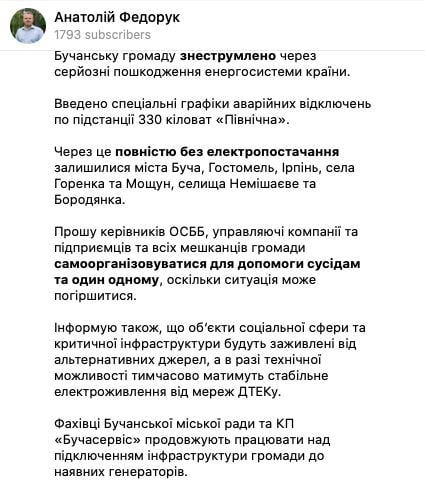«На приближение к графику пока даже не рассчитываем. По факту сейчас имеем мощность на 50% меньше необходимой. С которой нужно запитать критическую инфраструктуру», - написал Коваленко.
