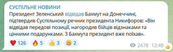 Позже в комментарии "Суспильному" пресс-секретарь президента Сергей Никифоров подтвердил визит Зеленского в Бахмут.