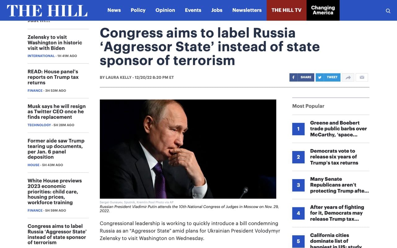 "Зеленский запросил статус государственного спонсора терроризма, а вместо этого администрация Байдена сказала им, что не поддержит его, но придумала альтернативный статус, которого даже не существует ни в национальном, ни в международном законодательстве США — нет никаких правовых оснований для этого. Это непродуманная пиар-мера, которая не накажет Россию и не поможет украинскому народу", — сказал The Hill помощник конгрессмена, знакомый с переговорами.