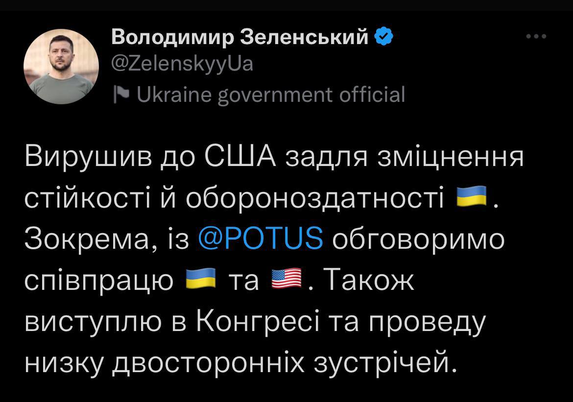 «Сегодня я – в Вашингтоне, чтобы поблагодарить американского народа, президента и Конгресс за столь необходимую поддержку. А также продолжить сотрудничество по приближению нашей победы. Проведу ряд переговоров по укреплению устойчивости и обороноспособности Украины. В частности, с президентом США Джозефом Байденом обсудим двустороннее сотрудничество Украины и Соединенных Штатов Америки», – написал он в своем телеграм-канале.