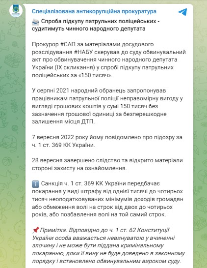 "Прокурор САП по материалам досудебного расследования НАБУ направил в суд обвинительный акт об обвинении действующего народного депутата Украины (IX созыв) в попытке подкупа патрульных полицейских за "150 тысяч", - сообщает САП.