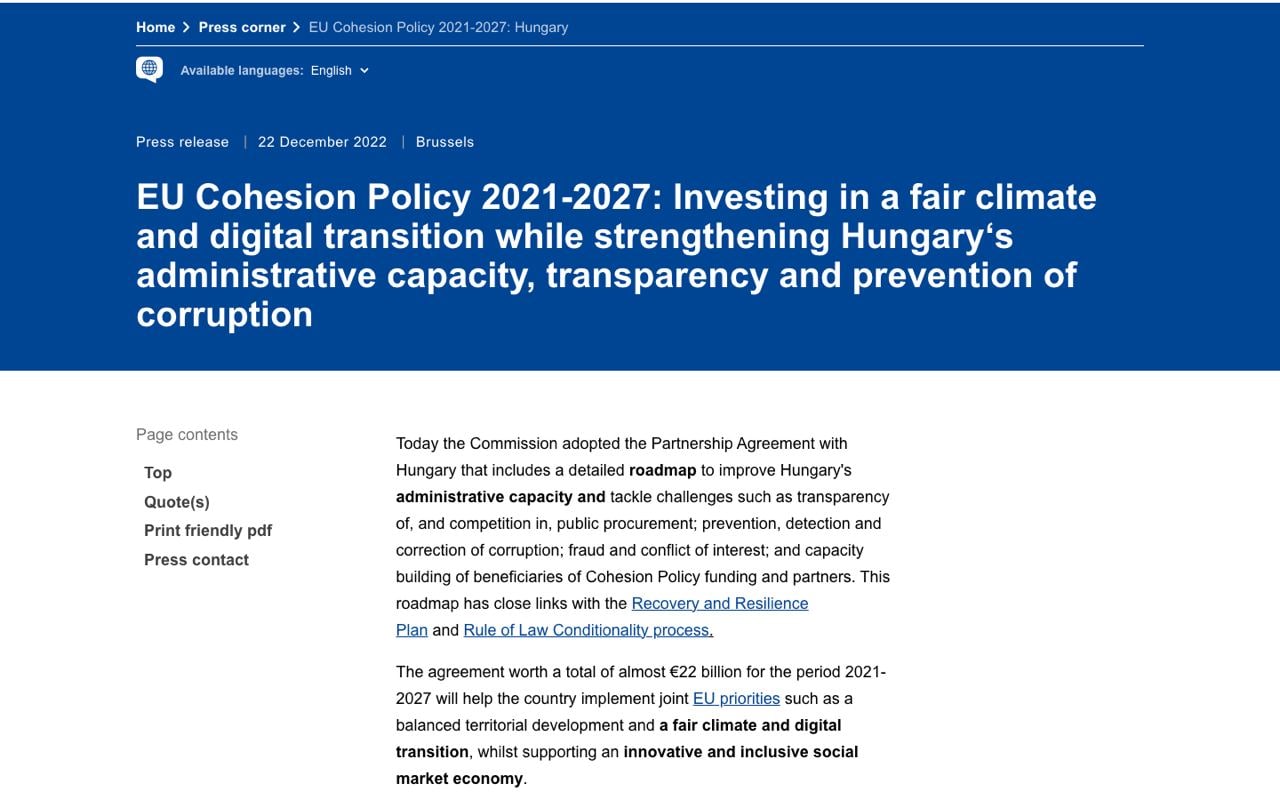Текущие 22 млрд евро для Венгрии должны были пойти на образование для детей из неблагополучных семей, модернизацию железнодорожного транспорта, доступ к широкополосной связи и помощь регионам, пострадавшим от закрытия угольных электростанций.