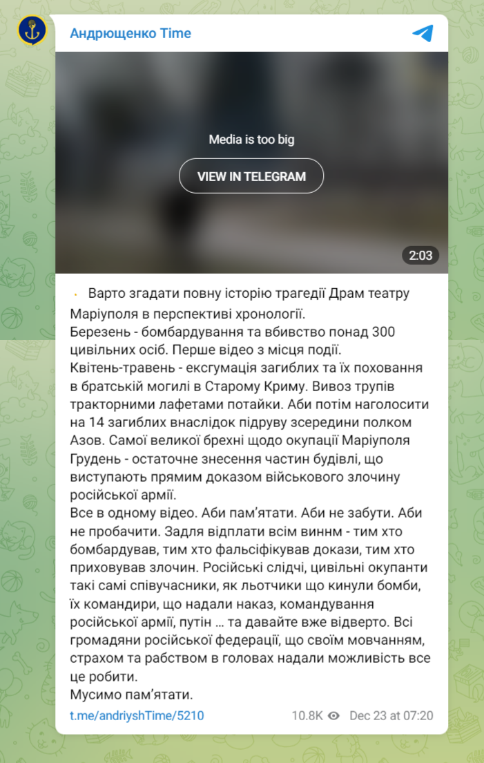 В апреле россияне впервые пустили в Мариуполь иностранных журналистов и показали им изнутри разрушенный драмтеатр. Тогда The Associated Press написало, что в разбомбленном драмтеатре Мариуполя могли погибнуть около шести сотен человек.