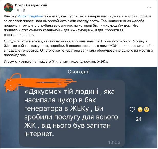 "Спасибо тому человеку, который насыпал сахар в бак генератора в ЖЭКе. Вы сделали услугу всему ЖК. От него был запитан интернет", - рассказывает Игорь Озадовский.