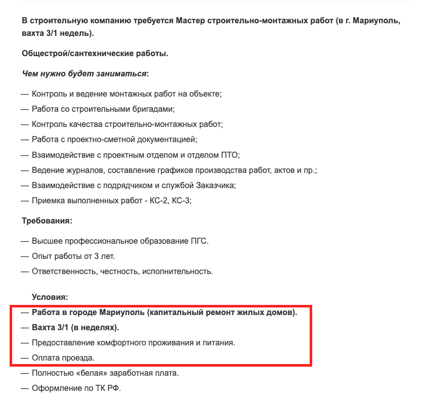 Берут на стройку и местных. Как сообщают в соцсетях, зарплата у строителей в районе 60 тысяч рублей (чуть меньше 30 тысяч гривен). У тех, кто вставляет окна, зарплата выше - около 90 тысяч (чуть меньше 45 тысяч).