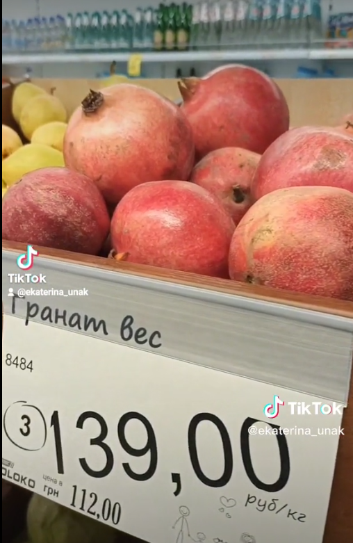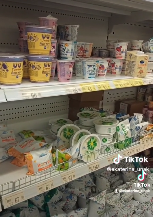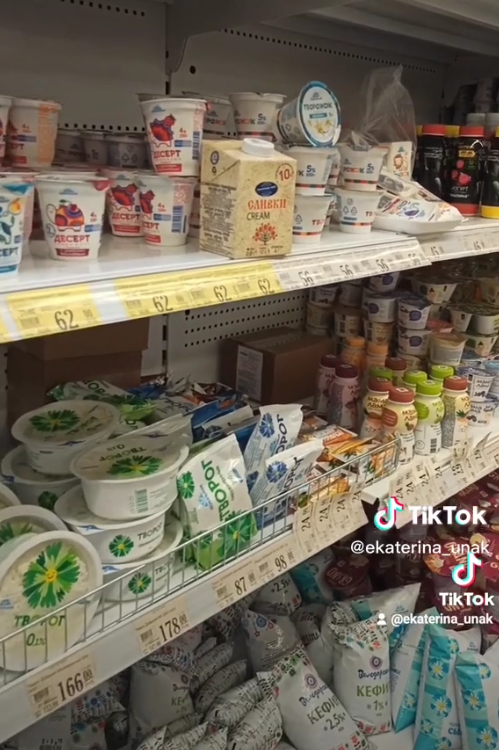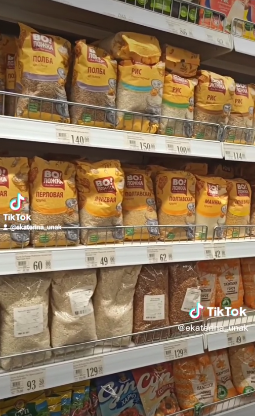 Судя по роликам из местных супермаркетов, пачка риса или гречки там стоит 100-150 рублей (50-70 гривен при курсе 2 к 1), упаковка творога - 166 рублей (80 гривен), йогурт - 67 рублей (30 гривен), пельмени - 260-315 рублей за килограмм (130-160 гривен).