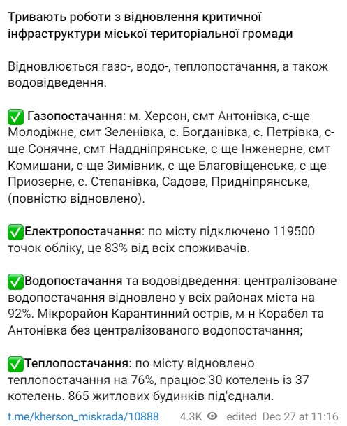 Кроме того, в Херсоне 83% всех потребителей подключены к электроснабжению. Централизованное водоснабжение восстановлено во всех районах города на 92%. Такие микрорайоны как "Карантинный остров", "Корабел" и "Антоновка" пока без централизованного водоснабжения.