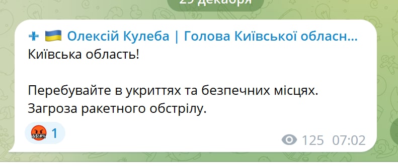 08:03 Есть угроза ракетного удара по Киевской области, сообщил губернатор Алексей Кулеба.