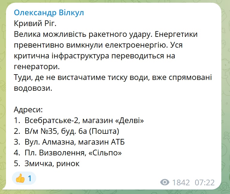 08:22 В Кривом Роге превентивно выключили свет, опасаясь ракетных ударов.