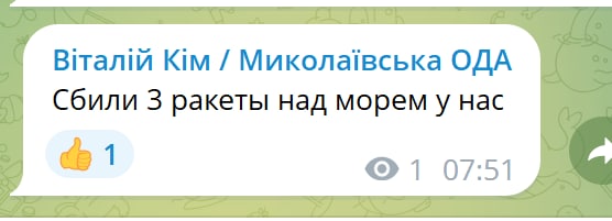 Тем временем губернатор Николаевщины Ким сообщил о сбитии еще двух ракет в Черноморском регионе.