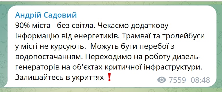 09:50 Большая часть Львова сейчас без света, электротранспорт остановлен. Могут быть перебои с водой, пишет мэр Андрей Садовой.