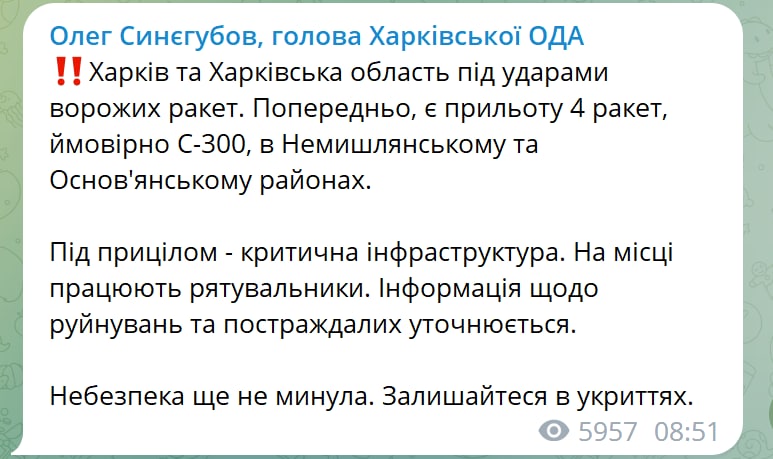 Напомним, губернаторы сообщили о пуске ракет по Украине этим утром.