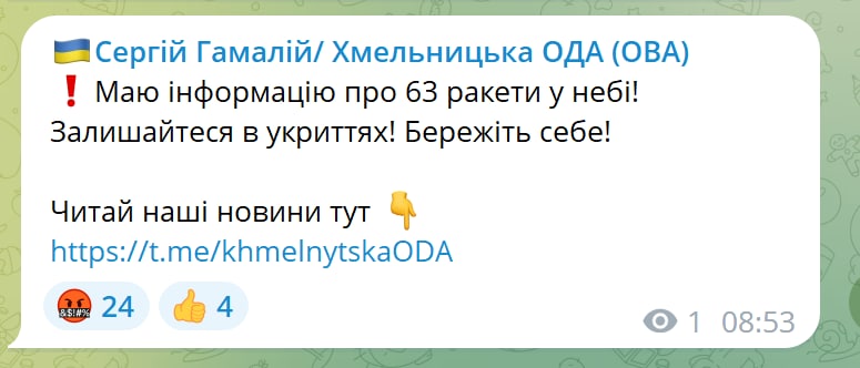 09:55 В небе над Украиной сейчас 63 ракеты, сообщил губернатор Хмельницкой области Гамалий.