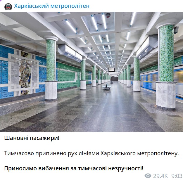 Харьковский метрополитен после атаки остановил работу по всем линиям. Об этом пресс-служба подземки сообщила в телеграм-канале