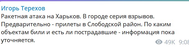 В Харькове утром 29 декабря прозвучала серия взрывов. Предварительно - ракетные удары были по Слободском району.