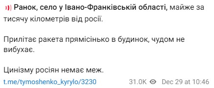 Советник главы Офиса президента Кирилл Тимошенко сообщил о прилете ракеты в село Ивано-Франковской области.