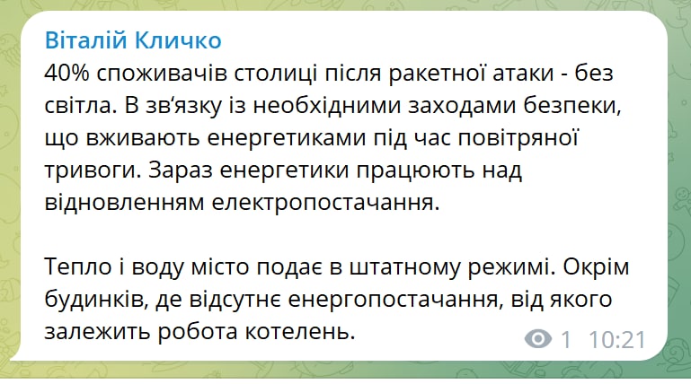 У 40% киевлян нет света после ракетной атаки РФ - Кличко