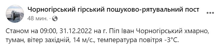 "По состоянию на 09:00, 31.12.2022 в г. Поп Иван Черногорский облачно, туман, ветер западный, 14 м/с., температура воздуха -3 градусов", - говорится в сообщении.