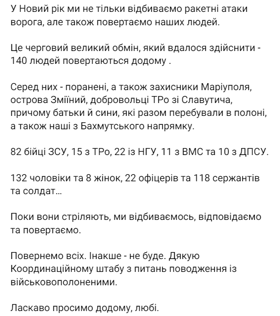 В субботу, 31 декабря, Украина в рамках обмена вернула из российского плена 140 военных: 82 из ВСУ, 15 из ТРо, 22 из НГУ, 11 из ВМС и 10 из Госпогранслужбы.