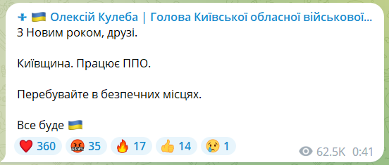 По словам главы Киевской областной военной администрации Алексея Кулебы, ПВО работает и в Киевской области. Он призывает жителей региона находиться в безопасных местах.