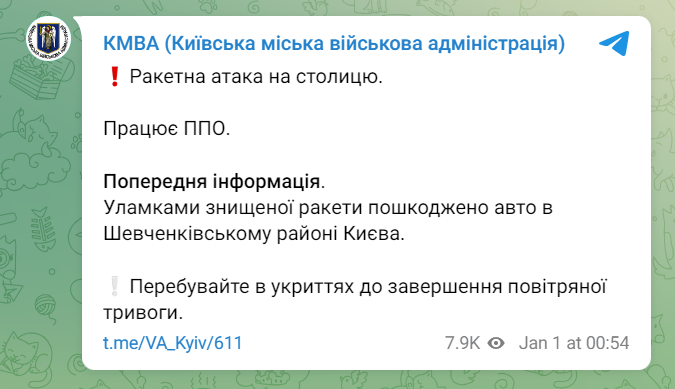 Напомним, РФ 31 декабря нанесла удары по Украине. Главнокомандующий ВСУ Валерий Залужный рассказал, что всего было выпущено более 20 ракет, 12 из них сбила украинская ПВО.