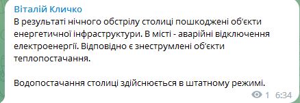 В городе ввели аварийные отключения электроэнергии. Есть обесточенные объекты теплоснабжения. Водоснабжение в столице осуществляется в штатном режиме.