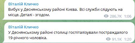 Ранее мэр сообщал, что ночью был взрыв в Деснянском районе Киева. В результате был госпитализирован 19-летний мужчина.