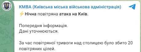 По предварительной информации во время атаки беспилотниками в Киеве было уничтожено 20 воздушных целей.