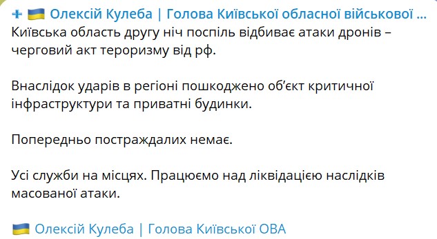 В результате ночной атаки беспилотников на Киевскую область поврежден объект критической инфраструктуры и частные дома.