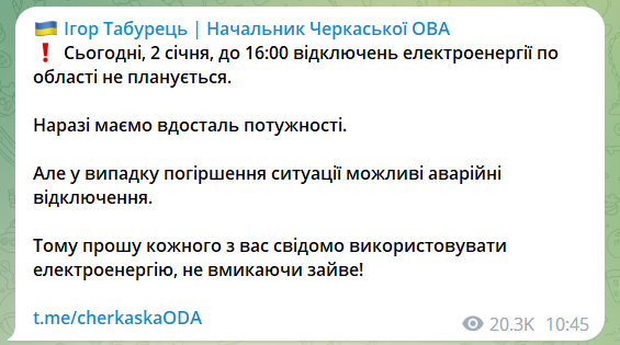 Также не планируется отключать свет до 16:00 в Черкасской области, сообщил губернатор области Игорь Табурец.