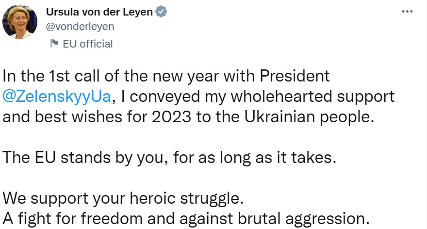 "В 1-м в новом году звонке президенту Владимиру Зеленскому я передала украинскому народу свою искреннюю поддержку и наилучшие пожелания в 2023 году", - написала Урсула фон дер Ляйен .