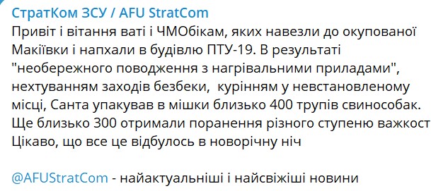 В Управлении стратегических коммуникаций ВСУ сообщили, что при ударе по ПТУ Макеевки погибло до 400 российских мобилизованных.