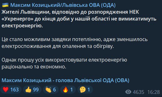 По словам главы Львовской ОВА Максима Козицкого, свет не будут отключать благодаря потеплению, поскольку уменьшилось электропотребление для отопления и обогрева.