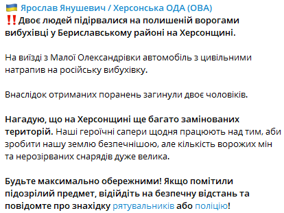 В Бериславском районе Херсонской области на выезде из Малой Александровки автомобиль с гражданскими наехал на российскую взрывчатку. В результате двое мужчин погибли от полученных ранений.