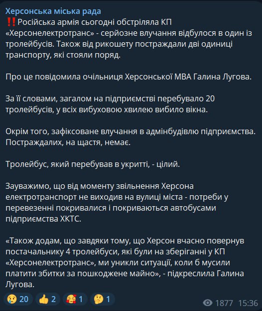 В Херсоне под обстрел РФ попал троллейбусный парк, весь транспорт остался без стекол