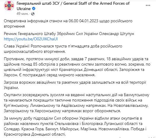 1. Противник, за прошедшие сутки, нанес 7 ракетных и 18 авиационных ударов, более 85 обстрелов из РСЗО. В частности, по гражданской инфраструктуре городов Краматорск, Запорожье и Херсон. Есть пострадавшие посреди мирного населения.