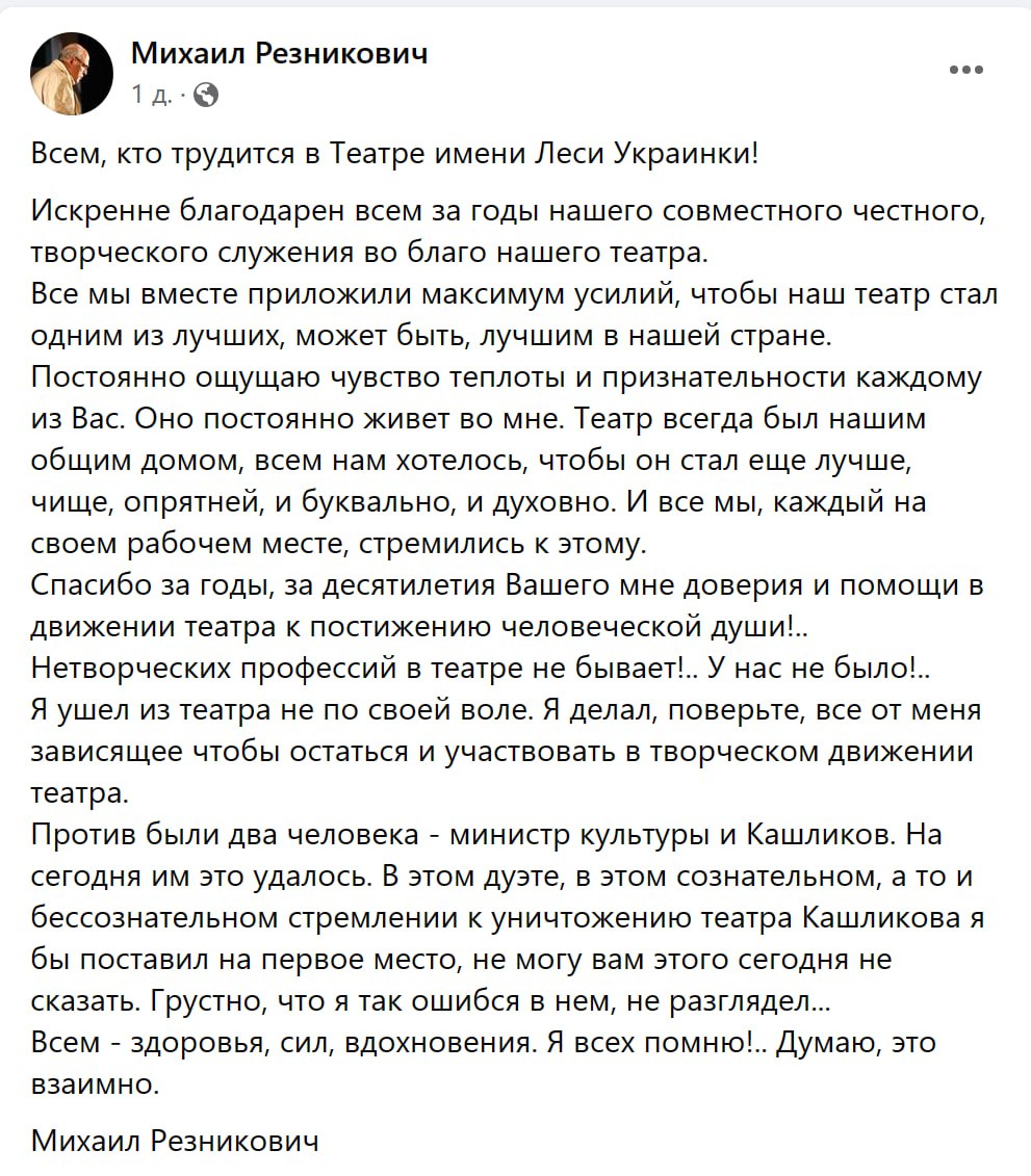 08.50 Театр Леси Украинки (бывший "русской драмы") покинул его многолетний руководитель Михаил Резникович. Об этом сообщил Минкульт. Резникович возглавлял театр с 1994 года.