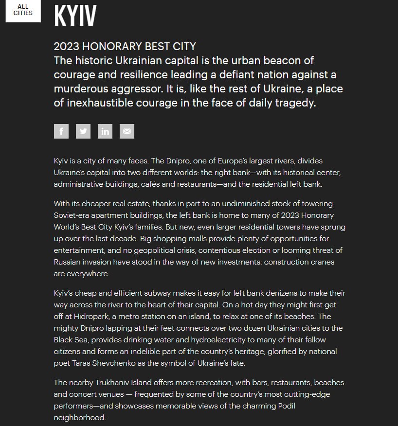 "Историческая столица Украины является городским маяком мужества и стойкости, ведущих непокорный народ против кровавого агрессора. Это, как и вся Украина, место неистощимого мужества перед лицом ежедневных трагедий", - говорится в описании к карточке Киева.