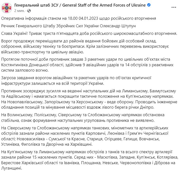 В среду, 4 января, в Украине идет уже 315-й день войны с РФ.