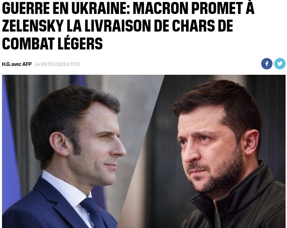 18.57 Президент Франции Эмманюэль Макрон сообщил Владимиру Зеленскому, что Франция поставит Украине бронемашины.
