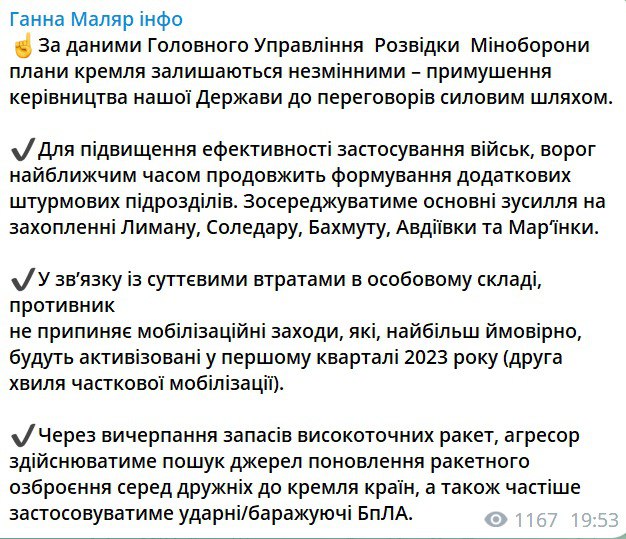 1. Для повышения эффективности применения войск армия РФ в ближайшее время продолжит формирование дополнительных штурмовых подразделений. Сосредоточит основные усилия на захвате Лимана, Соледара, Бахмута, Авдеевки и Марьинки.