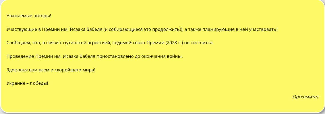 21.08 В этом году одесскую литературную премию имени Исаака Бабеля отменили из-за "путинской агрессии", сообщили организаторы. Проведение премии приостановлено до окончания войны.