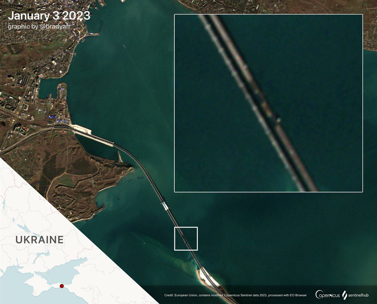 21.39 Cвежий спутниковый снимок Крымского моста опубликовал центр Copernicus.