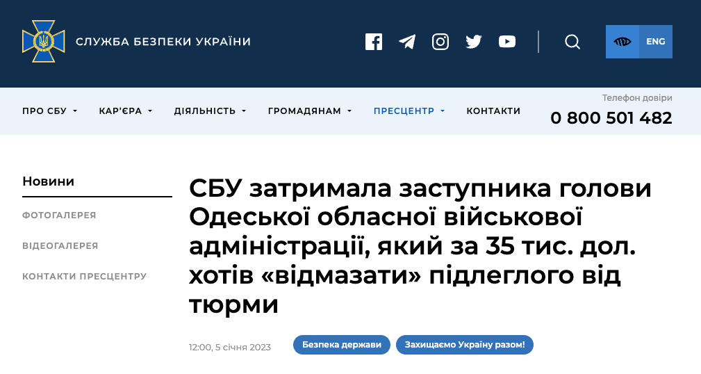 СБУ официально подтвердила информацию "Страны" о задержании замначальника Одесской ОВА Олега Муратова по подозрению в получении крупной взятки.